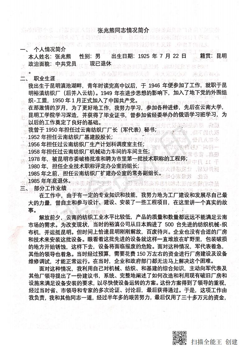 我出生于昆明滇池湖畔,青年时读完高中以后,于1946年便参加了工作,就职于昆明裕滇纺织厂(后并入云纺)。1949年在进步思想的影响下,加入了地下党的外围组织-工盟,1950年1月正式加入了中国共产党。