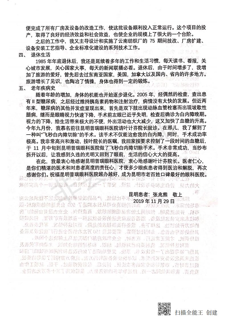 今年九月份,我慕名前往昆明普瑞眼科医院请叶计芬院长就诊。在那儿,我了解到了一种叫“飞秒白内障切除”的手术。该手术不仅能治愈我的白内障,同时,手术成功率极高。我非常高兴和激动,按叶院长的医嘱,我回家按要求控制了一段时间的血糖后,于11月中旬到昆明普瑞眼科医院做了飞秒白内障切除手术。手术非常成功,当纱布拆开以后,让我感到久违的光明又回到了眼前,生活的信心大大的提高。