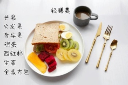 材料准备:准备若干芒果、火龙果、绿奇异果、黄奇异果、西红柿、生菜,洗净备用。准备若干鸡蛋、全麦方包、轻膳美营养膳食代餐粉,备用。准备高颜值碟、杯、刀、叉、勺等餐具。