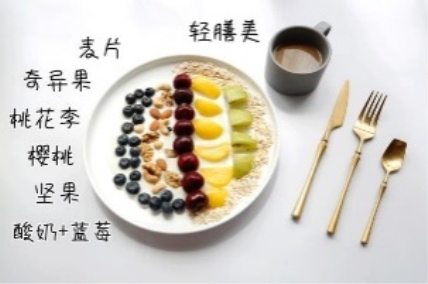 做法:奇异果、桃花李去皮切块,樱桃、蓝莓、坚果完整保留即可,麦片和酸奶围绕碟子边缘倒入,或按自己认为好看的排列方式摆盘即可。最后倒入热水和温水冲泡轻膳美营养膳食代餐粉,搭配颗粒分明,可可爱爱的轻食,萌萌轻食餐向你招手了哦。