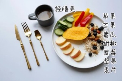 做法:红苹果和黄瓜切块,黄甜椒和红甜椒切条,芒果切块后斜切格仔花纹,取适量蓝莓、杂锦坚果和麦片散放于碟上,摆盘即可。倒入热水和温水冲泡轻膳美营养膳食代餐粉,一顿色彩丰富让人垂涎欲滴的减脂营养轻食餐便做好。