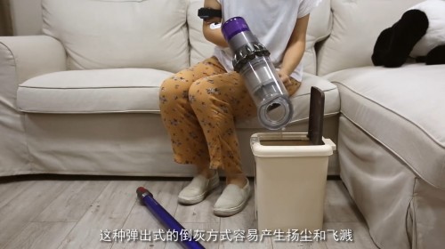 倒灰及清洁维护的难易程度也是吸尘器日常使用中的痛点。戴森两款吸尘器的集尘桶都采用“定点推射”设计,这种弹出式的倒灰方式容易产生扬尘和飞溅。且戴森两款产品的内部过滤组件与主机是一体的,只能进行简单的擦拭维护。