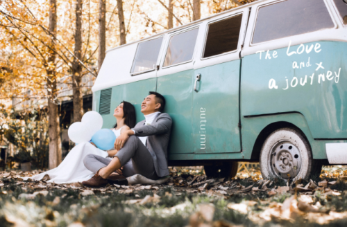 在室外拍婚纱照时,如果头部和身体如果成一条直线,难免会产生呆板的感觉。因此当身体正面朝向镜头时,头部应该稍微向左或是向右转一些,照片就会显得优雅而生动。同样道理,当新人的眼睛正对镜头时,让身体转成一定的角度,会使画面显得生气和动势,并能增加立体感。