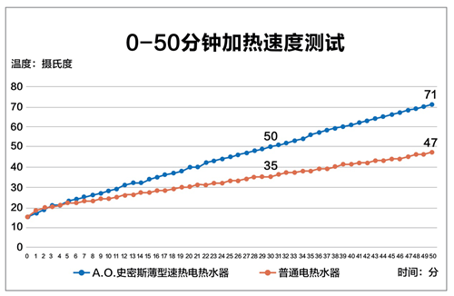 从温度与时间的折线图可以看到,第50分钟时,史密斯薄型速热电热水器的水温已经上升至71℃,而普通电热水器仅仅加热到47℃。