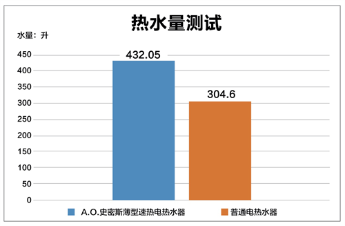 从实测数据上来看,史密斯薄型电热器出水81分钟,热水量432.05L,普通电热水器出水时间61分钟,热水量304.6L。当家里出现多人连续或者长时间洗浴的情况时,显然史密斯薄型速热电热水器的热水量更能满足需求。