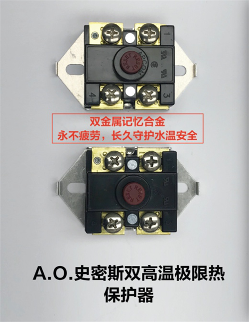 高温保护方面。普通热水器,高温极限热保护器多为20A容量,耐电压250V,余量小,A.O.史密斯配备了双重高温极限热保护器,达到40A大容量,耐电压277V,余量充足,可有效应对用户家电流和电压过大等异常情况;