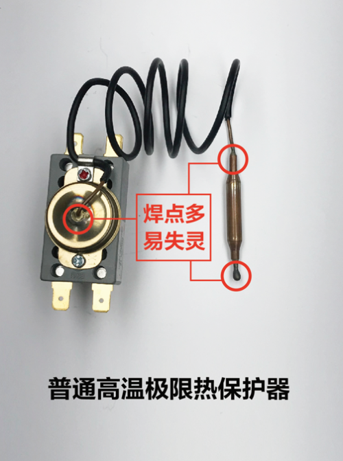 另外我们观察发现,A.O.史密斯的高温极限保护直接紧贴内胆表面,并采用美国原装进口的双金属片触发机构,可靠性很高。而普通的高温保护则是通过液压感温包来监测,感温包内部压力较高,且焊点很多,容易产生泄露,造成高温极限失灵,导致热水器无法正常工作。