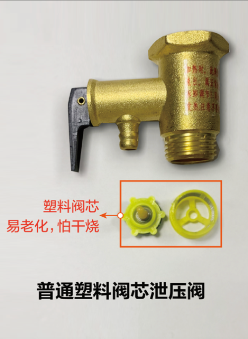 泄压阀作为释放内胆压力的重要零部件,很多电热水器为了节约成本,使用塑料阀芯。由于泄压阀经常处于高温的环境下,且可能面对干烧的情况。塑料阀芯会更容易老化损坏,且在干烧是会发生融毁,无法有效释放内胆压力,存在安全隐患。