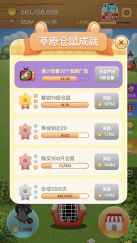 值得一提的是,这是一款全程免费玩的合成放置类游戏。有些消除或合成游戏在推到靠后的层数时会出现卡关的现象,如果不充值买道具的话,能不能成功就要靠人品了。但是在叠仓鼠,出现鼠洞不够用、仓鼠不够的情况时,可以通过看广告的方式获取辅助道具。另外,仓鼠们还会一直帮你收集金币,金币也可以拿来兑换更高级的仓鼠,快速升级。