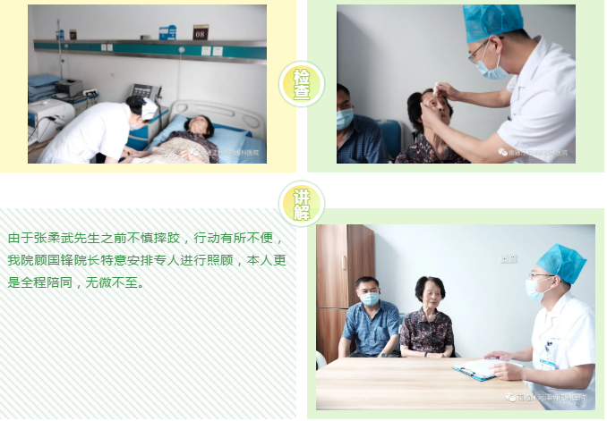 张柔武先生的小儿子石岩先生去年11月份曾在我院进行手术,今年5月份又在我院进行第二次手术,在我院治疗期间,石岩先生就张柔武先生的情况咨询了我院杨新生院长,在征得张柔武先生同意之后,我院顾国锋院长安排了杨新生院长、陆玲玲护士长等人上门为张柔武先生进行了一次检查,检查后确定张柔武先生的情况完全可以接受白内障手术,在医务人员耐心的讲解下和了解了石岩先生切身体会后,张柔武先生最终决定来我院就诊。