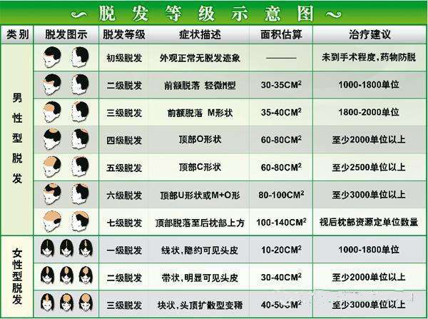 一般来说,脱发分为6个等级,脱发的等级在一定程度上决定了你需要移植的毛囊单位数量,一般来说,等级越高,脱发就越严重,植发价格就越高,举例来说,如果只是发际线微微上移,需要调整,那么所需要的毛囊单位就不会太多,而如果头顶大面积脱发的话,所需的毛囊单位就相对较多,价格自然偏高。