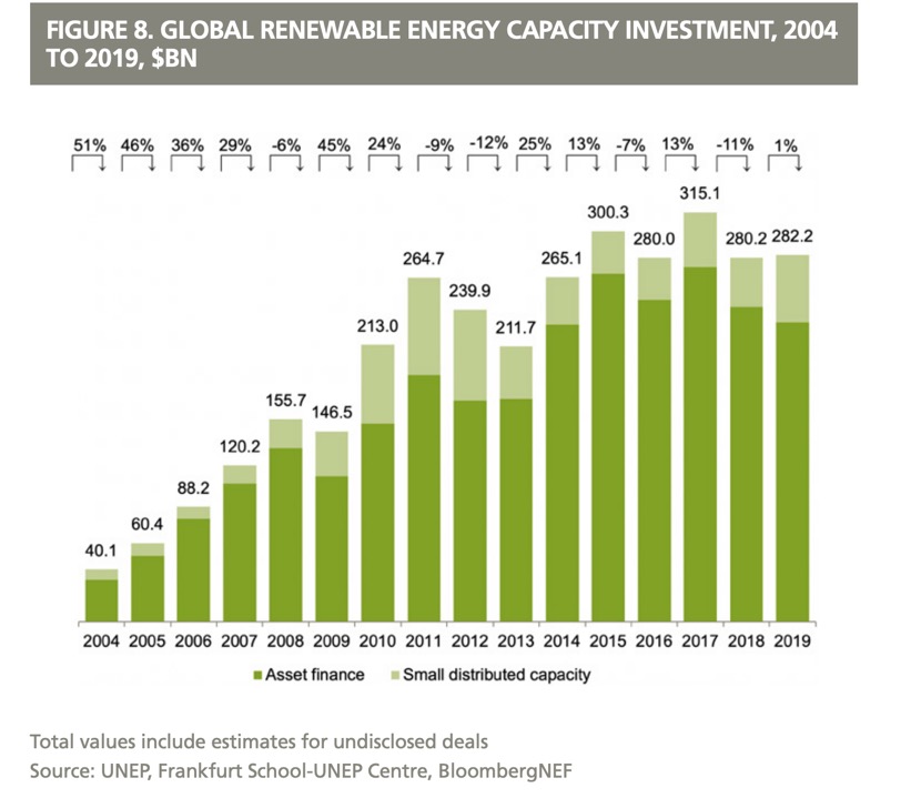 报告显示, 2019年,全球在新增可再生能源产能上投资2822亿美元(不包括大型水电),仅比2018年增长1%,相较2017年的3151亿美元低10%。但2019年新增的可再生能源发电量却是有史以来最高的,达到184GW(1GW=1000MW),比2018年的新增发电量高出20GW(12%)。