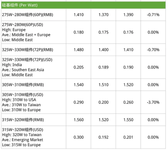 本周硅片价格整体价格走势与成交量趋于平稳。自硅片大厂调整价格告一段落后,本周的单晶报价大体呈现稳定的状态,且M6的硅片需求持续看好,而供给方面仍未爬升到稳定水平,故本周国内市场大硅片均价稳定在2.55元/片,海外均价稳定在0.315美元/片。反观多晶硅片的部分,价格持稳在每片1.08-1.52元之间,但因为需求量少,整体开工率低,虽然市场上的供应量已逐步减少,由于订单需求依旧惨淡,导致现有库存消耗仍然缓慢。