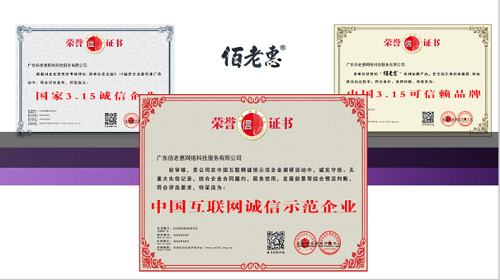 我们佰老惠自建立以后,服务了无数的客户群体,得到了良好的市场口碑,获得了包括“企业信用评价AAA级信用企业”,“3a级重合同守信用企业”,“3a级重服务守信用企业”、“中国互联网诚信示范企业”、“中国315可信赖品牌”,“中国315诚信企业”等一系列的荣誉,所以,不论你是否选择跟我们合作,今天你所了解的是一家完全可以值得信赖、赞誉极佳、用户众多的正规企业。