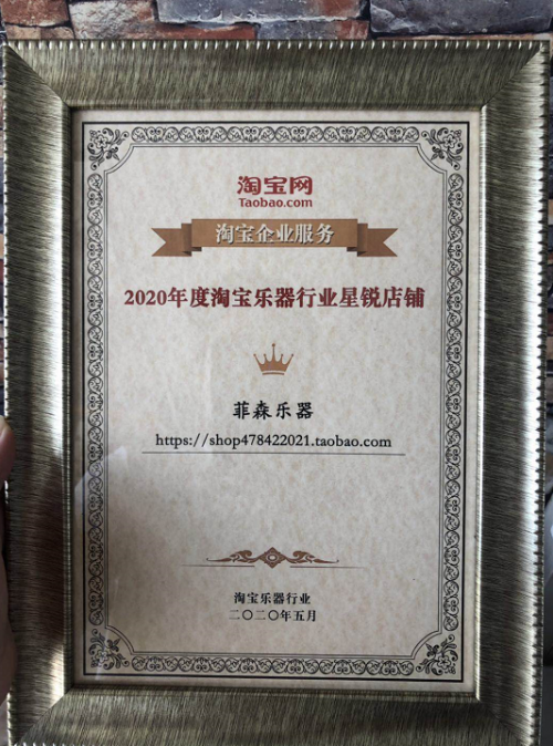 2020年6月刚结束的淘宝乐器年度电商大会暨颁奖典礼上,菲森乐器再摘桂冠,获得“2019——2020”年度淘宝乐器行业星锐店铺荣誉称号。