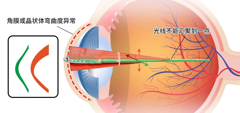 散光是眼睛屈光不正的一种状态,造成散光的原因是角膜或晶状体表面弯曲度不一致,如橄榄球状,导致相互垂直的两条子午线的屈光力不同无法聚焦一点,形成不清晰或重叠的影像,看远看近都不清楚。