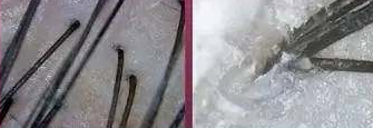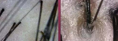 上面的图片是非常健康的头皮状态,大家可以清楚地看到头皮上非常的干净、平整,没有油腻的现象,一个毛囊中生长了好多根头发,正常人的毛发密度在100~140fu/平方厘米这个范围内,从视觉上来看,这类人士的头发就比较浓密,给人的印象是发质健康。