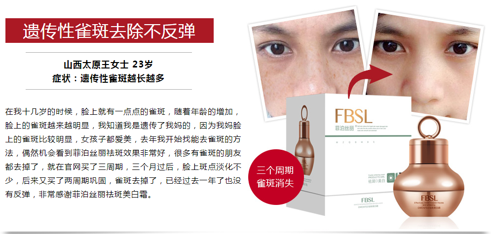 菲泊丝丽23年以来专注美白祛斑,力争帮助越拉越多的有斑群体成功祛斑,菲泊丝丽已经上市,凭借着自身的祛斑实力,收获了广大消费者的青睐和良好口碑!在众多品牌中脱颖而出,更是被消费者誉为“一款有深度的祛斑霜”菲泊丝丽主要成分是采用目前祛斑效果比较好的天然绿色植物,熊果苷、芦荟等,祛斑、美白、提亮肌肤三效合一!祛斑的同时也可以每天让我们的皮肤保持最好的状态!
