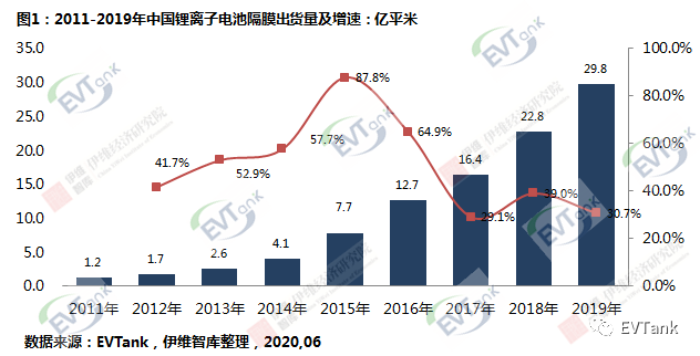 :《中国锂离子电池隔膜行业白皮书(2020年)》数据显示,2019年,中国锂离子电池隔膜的出货量为29.8亿平米,同比增长30.7%。其中湿法隔膜出货量占比达到67.1%,比例进一步提升。