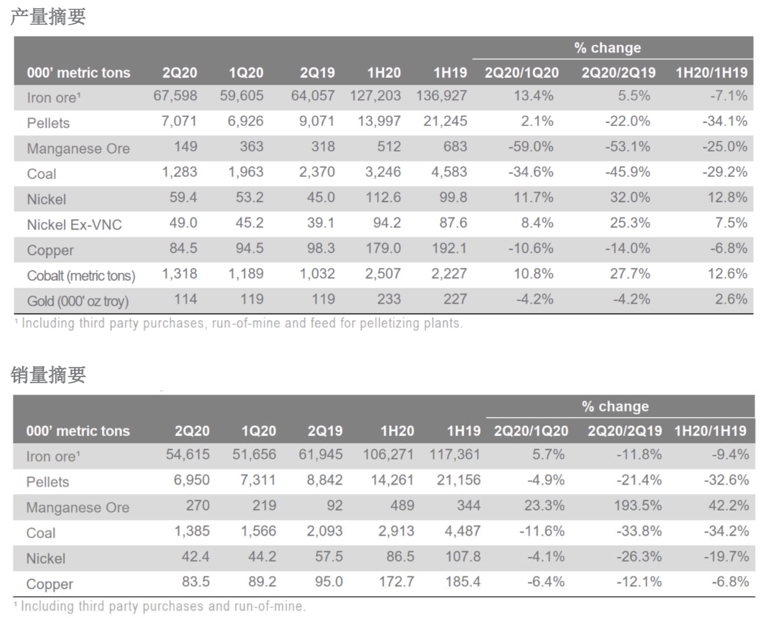 2020 年第二季度,铁矿石粉矿和球团矿的销售溢价为7.5美元/吨,销量为6160万吨,较产量低8%。