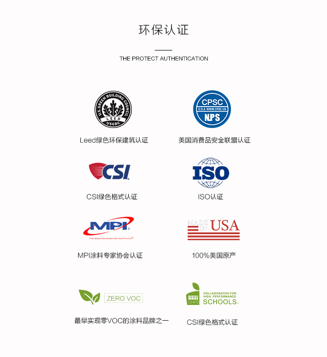 高端的品质和过硬的生产技术,为美国维萨涂料赢得了多项国际权威环保认证,其中包括:MPI 北美MPI环保标准认证、CPSC美国消费品安全联盟认证、LEED美国绿色建筑协会绿色评估体系、CSI 美国CSI绿色格式认证和CHPS北美高能效学校协作联盟认证,这也为消费者的健康提供了强有力的保障。