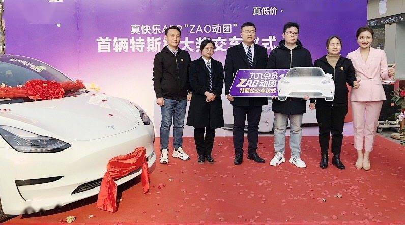 1月19日,国美零售真快乐APP“ZAO动团”活动首辆特斯拉大奖交车仪式在河南洛阳隆重举行。交车仪式现场,获奖人楚先生在家人和工作人员的簇拥下,接过特斯拉Model 3的钥匙,将新车开回家。