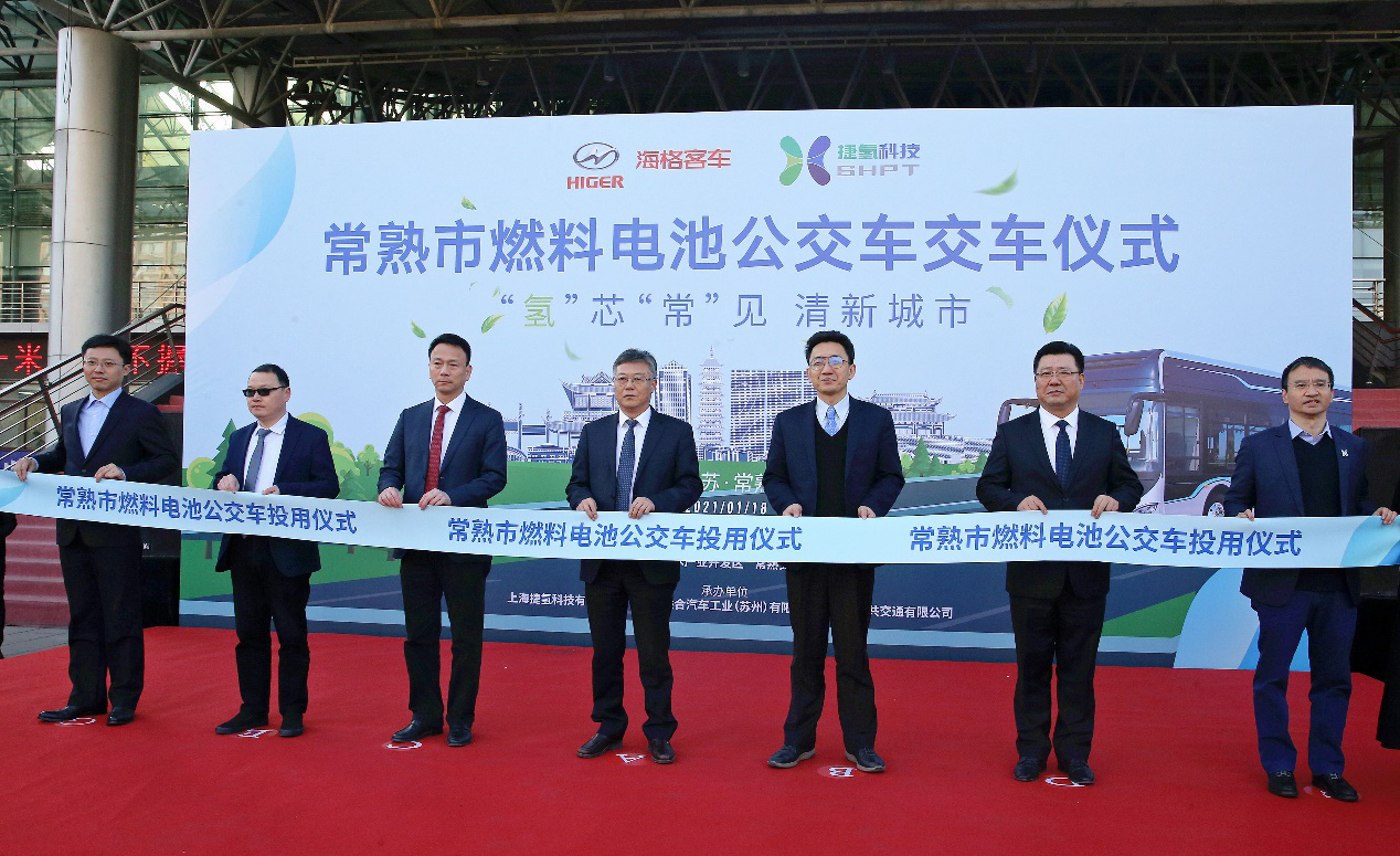 2021年1月18日,由常熟高新技术产业开发区、常熟交通运输局主办的“‘氢’芯‘常’见 清新城市 常熟市燃料电池公交车交车仪式”在常熟国际展览中心举行,16辆苏州金龙海格氢燃料电池公交车正式交付常运公共交通有限公司(简称“常运公交”)。这是继2020年初常运公交采购20辆海格蔚蓝氢燃料电池公交投入商业化运营后的再次批量采购。该批氢能公交由苏州金龙与上汽集团子公司上海捷氢强强联手,投入运营后将助推常熟氢燃料公交事业发展再上新台阶,凸显长三角氢走廊建设推进的聚能效应。