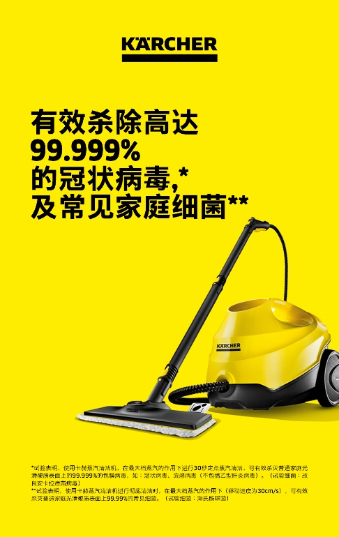 卡赫为疫情推出深度杀菌消毒全套解决方案,并在全国各地全面落地。2020年,卡赫家庭用高温高压蒸汽机在中国全网销售超20 万台,1000 多万家庭体验到卡赫蒸汽深度清洁科技。同时卡赫蒸汽清洁机的消毒杀菌作用,已在德国独立实验室的测试中得到了验证:若使用得当,卡赫蒸汽清洁机可有效杀除硬质表面上高达99.999%的包膜病毒*,如冠状病毒或流感病毒,以及99.99%的常见家庭细菌**。