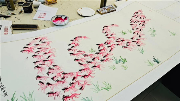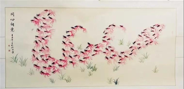 《同心向党百鱼图》是由河南省工艺美术大师、濮阳市文联副主席王濮方构思创意,作为王濮方老师的亲传弟子,王玲玲耗时一周时间精心创作而成。该幅作品长172厘米,寓意着建党100周年和建国72周年,画中的19株水草代表着19大精神的传承,100条红色金鱼围成数字“100”组成龙形图案,寓意着“中华第一龙”的出土地濮阳,必将在中国共产党的领导下,在中原经济区建设中出新出彩,实现巨龙腾飞。同时100条金鱼同向而游也寓意着全国各族人民同心向党,共筑中国梦。