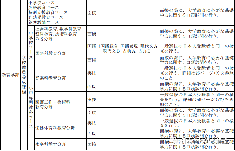 一般为面试、実技(涉及到美术,音乐、体育等学科),另外国語科教育分野还需要准备日本语的笔试内容。