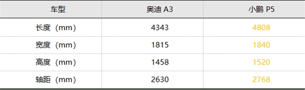 首先来看两款车型的空间,奥迪A3的车身尺寸为4343×1815×1485mm,轴距为2630mm;与之相比,小鹏P5车身的长宽高为4808×1840×1520mm,轴距为2768mm,孰胜孰负一目了然。空间力占优势,意味着能带来更宽绰的驾乘空间和储物空间,能更好地满足家庭出行、长途自驾等用车需求,拉满实用性,而小鹏P5的空间表现不仅强过奥迪A3,更比绝大多数的B级车都要优秀。