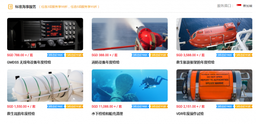 记者在海运在线网站看到,GMDSS 无线电设备年度检验、消防设备年度检验、救生艇及艇架年度检验、救生筏年度检验、水下检验和船壳清理、VDR年度操作试验等多项海事服务,均已实现标准化,用户只需选择服务类型,加入购物车即可订购。在新加坡地区,这些服务还明码标价。在其他地区,客户只需在线询价,即可快速得到报价。