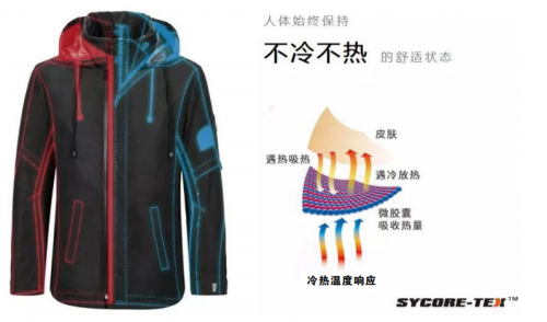 依托于中科院化学所基础研究成果,段宇晶带领团队研发出的SYCORE-TEX新材料在国内乃至国际市场上都属于首创,有着智能温度记忆功能、耐高压性能、轻盈便捷、防风保暖、适应性广、易清洗打理、易缝制等诸多优点。段宇晶介绍说,“SYCORE-TEX技术是将自主研发的高性能大分子材料通过微胶囊的形式均匀分布于纺织材料中,形成的复合材料体系对温度变化具有敏感性,当含有高性能大分子材料的纺织品所处环境具有明显的温度差时,通过对热量的吸收或释放努力去平衡环境中的温度差,以达到一个优于以往的均衡状态。这种智能的温度记忆功能使得这种新型纺织材料表现出对温度异于以往的‘惰性’,正是这种‘惰性’提升了材料对微环境温度差的平衡能力,从而使人体在实际穿着中感受到明显的暖意或凉感。”