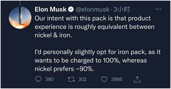 有车主在社交媒体上询问特斯拉CEO马斯克,两款车型有什么区别。马斯克回应称:自己更喜欢磷酸铁锂电池,因为可以充电到100%,而三元锂电池只建议到90%。