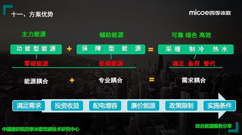 作为综合能源解决方案的先行者,四季沐歌始终秉承“零碳供热、多能互补;供储结合、分布应用;需求耦合、效率优先”的原则,从不同维度紧抓优质项目,从政策线、投资线和能源线进行着手,为客户提供“三维度”保障服务能力,打造“特种部队”并为其提供科学的综合能源规划方案。目前,从满足需求、投资收益、配电增容、廉价能源、政策限制、时事条件等方面综合开展低碳清洁能源综合解决方案,全方位满足学校医院、住宅办公等不同场景对于能源规划个性化需求,从而为客户提供“零碳”“低碳”的系统设计方案,而这也是国网综能公司选择四季沐歌的原因。