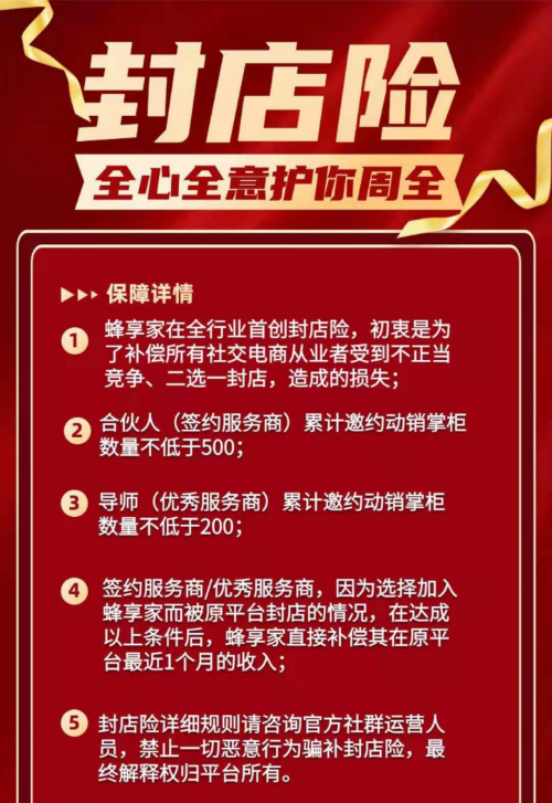 公司特此为转型的大团队长制定了平移政策,高起点还有高奖励!同时,为解决一些有意转型团队长的后顾之忧,还特别制定了封店险。封店险就是别的平台的团队长因为转型蜂享家,她原来的平台把她账号封了,我们蜂享家会补偿她原来的平台最近一个月的收入。