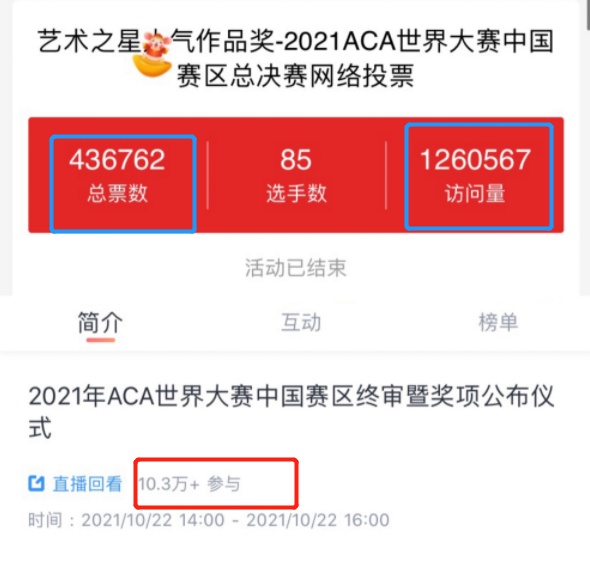 10月22日,艺术之星人气作品奖-2021ACA世界大赛中国赛区总决赛网络投票结果公示,人气作品奖第一名投票票数:30541