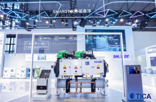 此次SMARDT重点展示的磁悬浮系列机组,具有无油、多机头、磁悬浮无摩擦、变频调节等特点,使用时节能率可达40%,后期可省50%的维护费。除此以外,此机组还搭载了可适配光伏、风能等新能源的创新型技术,让建筑、工业、交通等碳排放主体的制冷系统更高效、更低碳,有效解决了“能耗大户”既要绿色又要发展的多元诉求,为碳中和作贡献。