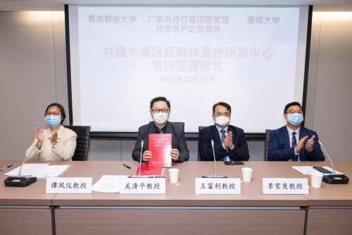 香港都会大学与广东内伶仃福田国家级自然保护区管理局及深圳大学,在10月19日签订框架协议,共同建立「大湾区红树林湿地研发中心」(中心),促进深港合作和发展大湾区红树林湿地研究。