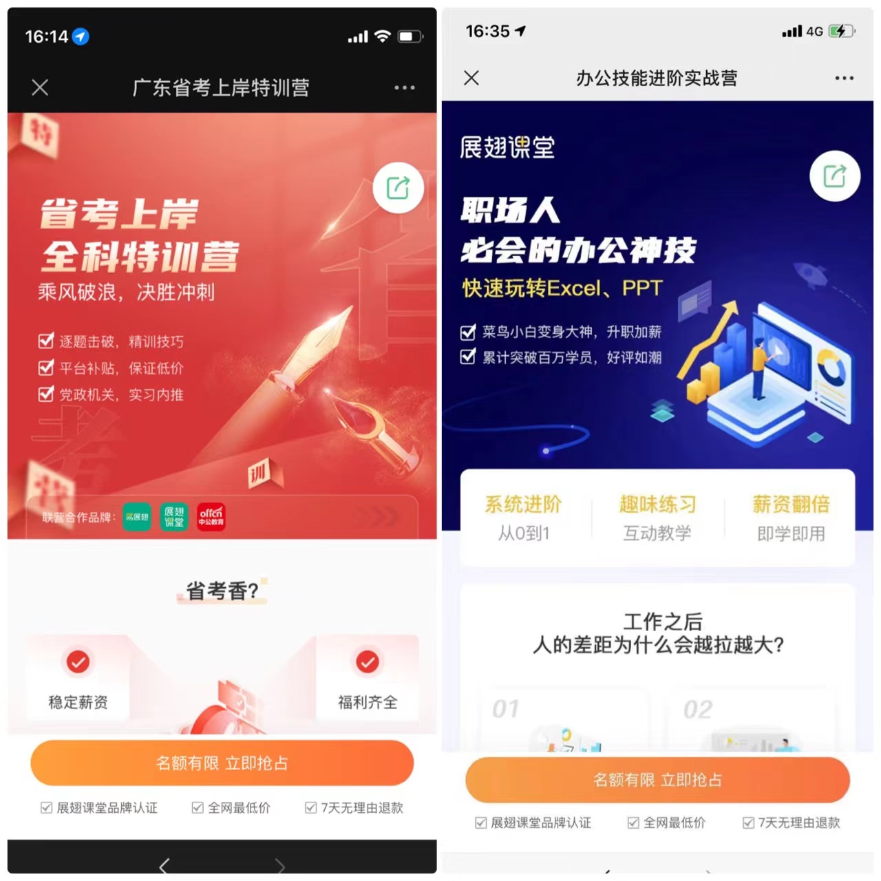 联营机构“精品课”模式,将整合易展翅与展翅课堂平台优势资源,着力提供流量支持与技术支持。依托易展翅平台1300万用户流量基础,展翅课堂将根据机构与精品课程定制全平台营销计划,上线专项课程专题并直接连接机构主页,实现新媒体、社群、App端内广告位等全渠道推广,为机构带来精准客群真实流量;此外,展翅课堂还将向意向学员开放“平台课程补贴”,以更低的成本门槛吸引用户报读精品课程,有效提高课程转化。