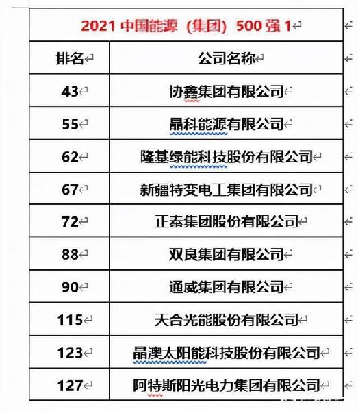 近日,中国能源经济研究院公布了2021中国能源(集团)500强榜单,协鑫集团、晶科能源、中环股份、隆基股份、天合光能等44家光伏企业上榜。其中,协鑫集团在总榜单排名43,在44上榜光伏企业排名居首,其次是排名55位的晶科能源,排名62位的隆基股份,排名67位的特变电工,排名第72位的正泰集团,排名第88位的双良集团,排名第90位的通威股份。