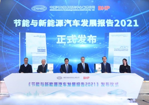 发布会上,在现场和云端观看的行业、企业专家的共同见证下,中汽中心副总经理吴志新、必和必拓中国区总裁王跃奎、天津大学教授姚春德、中国电子科技集团公司第十八研究所研究员肖成伟、上汽通用五菱总经理助理梅胜军、北汽新能源总经理助理刘晓萌等初版单位、支持单位领导,行业和企业专家代表上台,共同发布《节能与新能源汽车发展报告2021》(以下简称“报告”)。