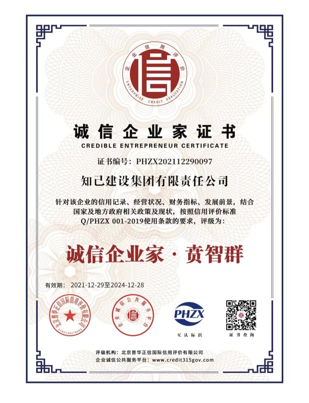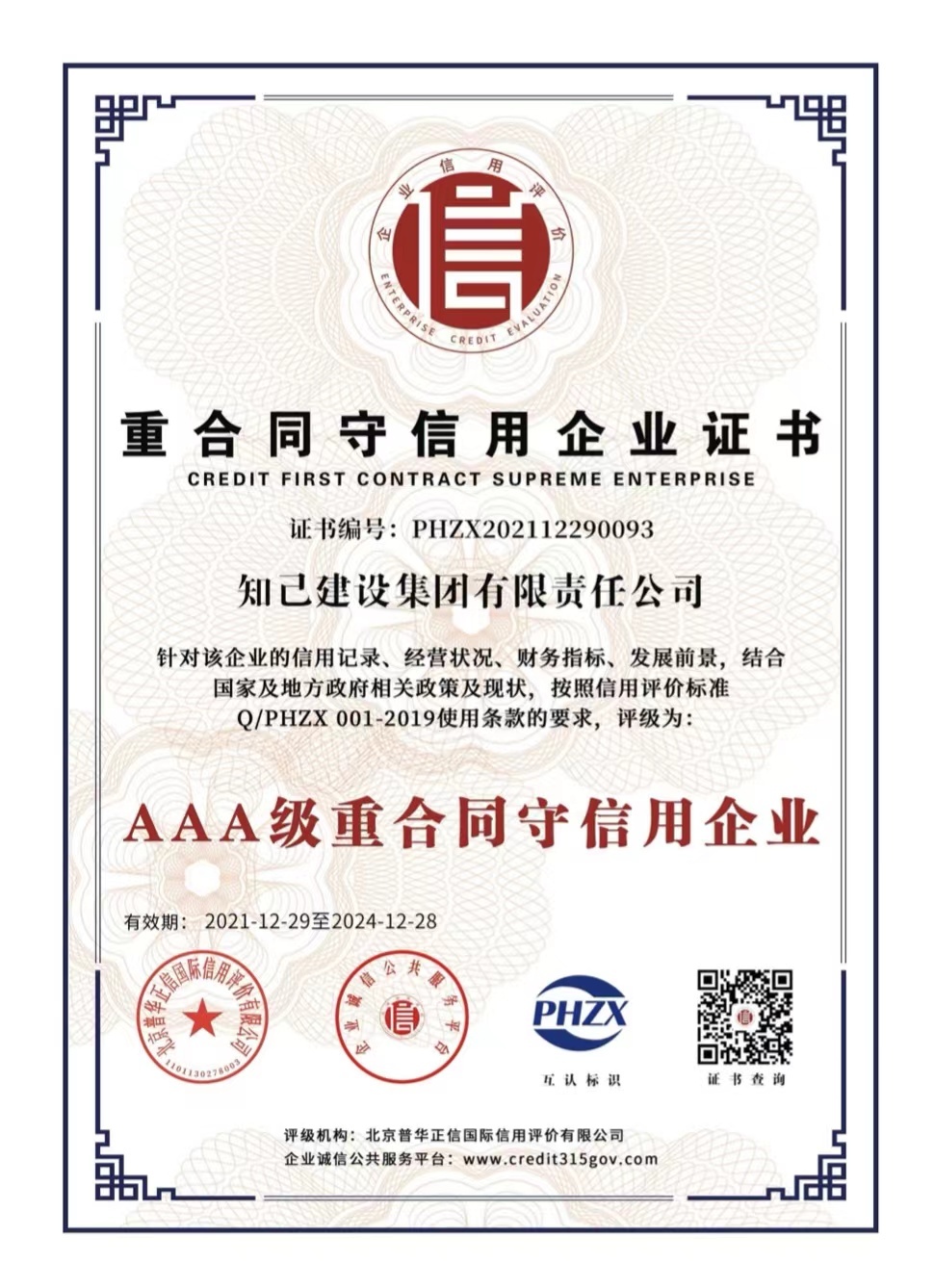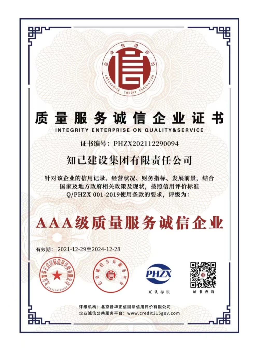 知己建设集团有限责任公司始终加强企业诚信建设,将诚信建设贯穿于生产经营管理的全过程,将诚信建设转化为全体员工的自觉行动,做到诚信经营、守法经营、规范经营。