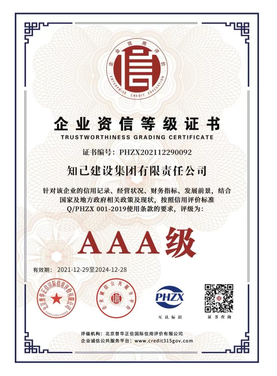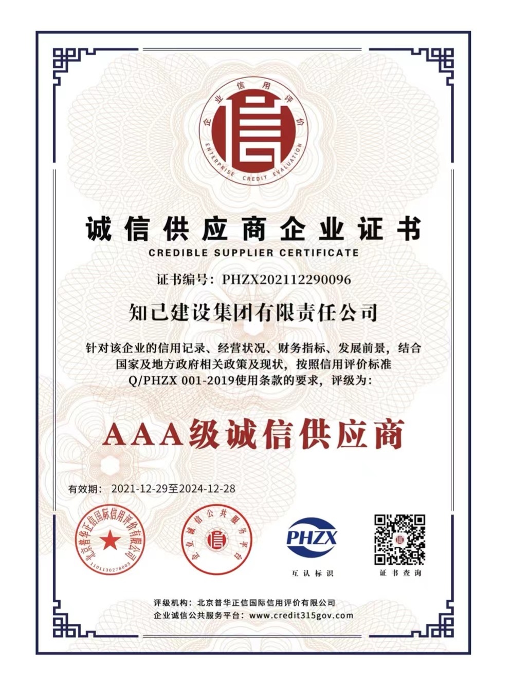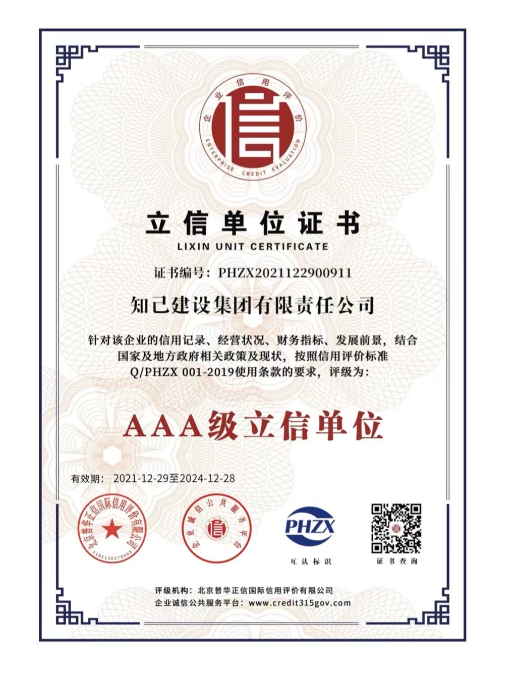 诚信是立业之本,只有守信用的企业,才能得到社会公众的信任。知己建设集团有限责任公司获得AAA级信用评价是行业对知己建设集团有限责任公司诚信经营的认可与表彰,这与知己建设集团有限责任公司多年来坚持诚信经营的企业价值观密不可分。未来,知己建设集团有限责任公司将再接再厉,为社会诚信体系建设添砖加瓦!