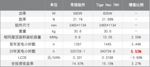 根据对比Tiger Neo78片N型组件与同版型P型产品,在同样屋顶面积条件下,安装更多组件、有效提升装机容量,叠加Tiger Neo系列组件自身优势后,整体提升项目表现。