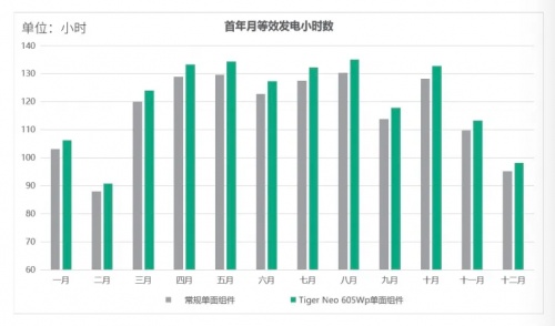 与P型组件相比,Tiger Neo 605高效组件全年各月份等效发电小时数均比P型更优,在夏秋季时(4-10月)尤为显著,该时节等效发电小时数可比P型高至3.67%,全年等效发电小时数则比P 型高出3.43%,再次凸显Tiger Neo系列组件在项目地卓越的发电性能。