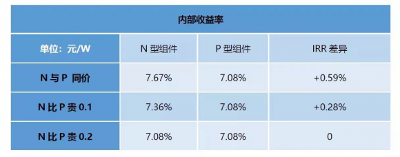 假如N型组件与P型组件价格相同,那么可以为项目带来IRR提升0.59%。