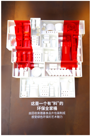 除却通过技术实现绿色环保的餐厅运营,肯德基“小绿店”也将成为一个面向公众开放的、融合了科技与人文色彩的互动体验空间。除了在餐厅绿色节能设施旁设置趣味科学说明文字,店内的环保艺术装置也为餐厅增加了年轻、文艺气息。北京“小绿店”中将展示一个特殊的“全家桶”,由回收肯德基食品外包装制成,展现绿色环保的艺术魅力。而在杭州“小绿店”,消费者可通过店内的艺术墙洞,窥见未拆除的餐厅前两代装修材料,了解到餐厅升级改造时的环保巧思。
