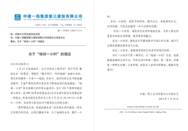 为认真践行绿色发展理念,以实际行动促进人与自然和谐共生,中建一局三公司河南分公司下发“地球一小时”倡议书和海报,呼吁广大职工在4月22日20:30—21:30熄灯一小时,以一小时的缄默,唤起社会各届保护地球的责任感。