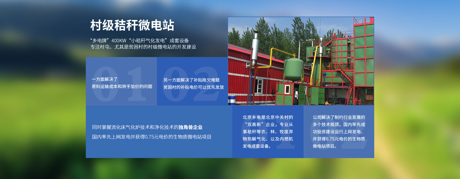 北京乡电电力有限公司是专业从事“乡村秸秆微电站”项目的核心设备提供商和全系统集成商,依托自身的技术优势,开发出400kw小秸秆微电站成套设备,专注村屯、尤其是贫困村的村级微电站的开发建设,一方面解决了原料运输成本和转手加价的问题,另一方面贫困村的补贴电价可以优先发放,解决了补贴拖欠难题,最重要的是生物质气化发电领域由于存在较高的技术门槛,为乡电技术的快速复制和推广提供了巨大的市场空间。
